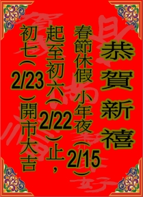 春節休假2/15~2/22,期間網站可正常接受訂貨,商品...